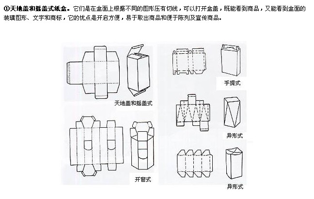 這種形式的紙盒式常用在禮盒包裝中,其特點是便于攜帶。但要注意產品的體積、重量、材料及提手的構造是否相當,以免消費者在使用過程中損壞。